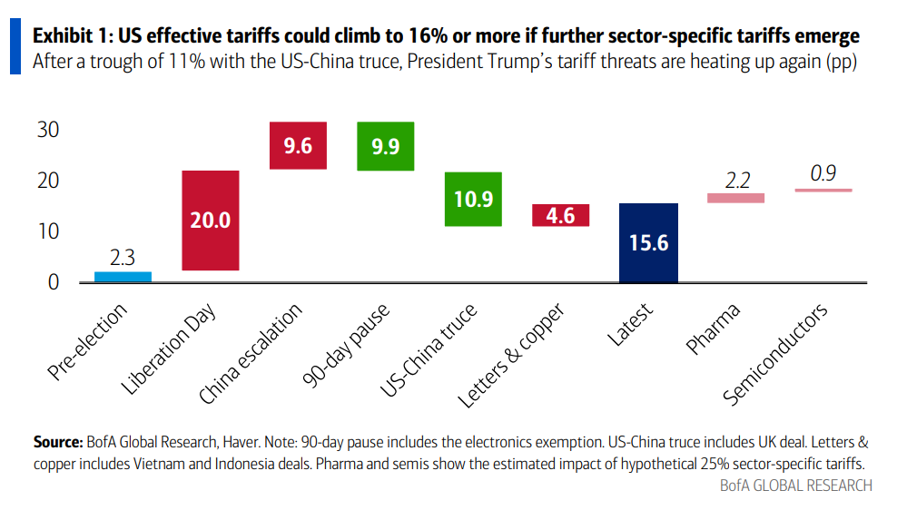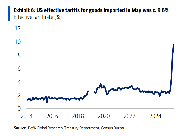 据追风交易台消息,美银分析师在7月22日的报告中表示,基于过去12个月的进口构成计算,最新关税公告将使美国有效关税率上升近5个百分点至约16%。这一水平远超美银此前预期的10%基准情形,构成明显的上行风险。